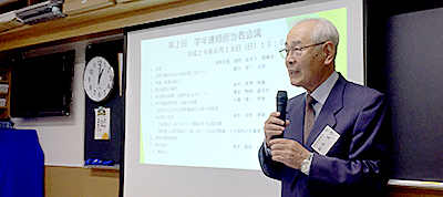 会議は浅野学園長の挨拶で始まり、藤井会長からは今は亡き濱野富美子前同窓会理事長から濱野重郎先生のご意志を継承した同窓会の再構築のご依頼をお受けしてから約4年が過ぎ、浅野理事長を初めとする学園の強力なお力添えと「清明学園is Forever:清明学園は永遠なり」の合言葉の下、卒業生理事の協力と学年連絡担当者の皆様を初めとする多くの同窓生のご支援により何とか軌道に乗せることが出来たことへの感謝と創立90周年に向けての益々の協力のお願いの言葉とが有りました。