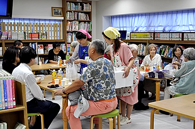 『同窓生の部屋』でソフトドリンクや、つき立てのお餅を食べながら談笑する同窓生の皆様